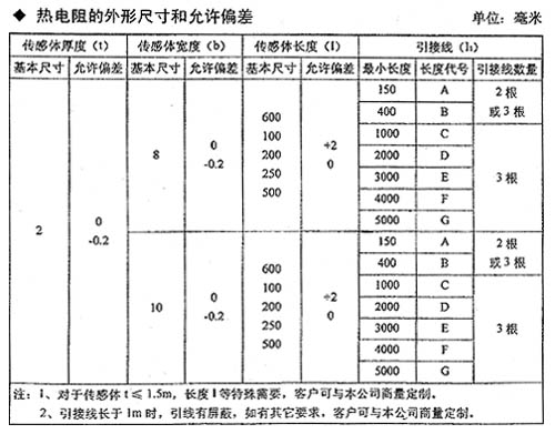 ◆ 基本技術參數 ※ 熱電阻為連續工作時,防護等級為IP65。 ※ 熱電阻的常溫絕緣電阻大于100M Ω。 ※ 熱電阻的上限溫度絕緣電阻大于10M Ω。 ※ 基本參數表 表1